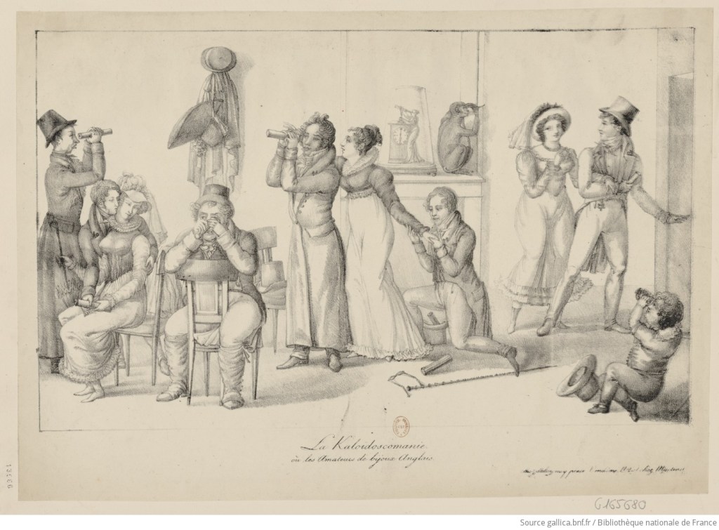 Il y a dans le bas à droite un enfant assis à même le sol qui regarde aussi au fond d’un appareil. Dans un article de presse du Journal de Paris de 1818, on précise qu’il regarde dans un microscope, qui était un nom donné à un ancien jouet français, ancêtre du kaléidoscope.