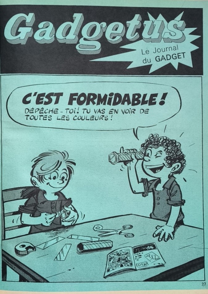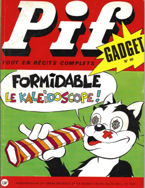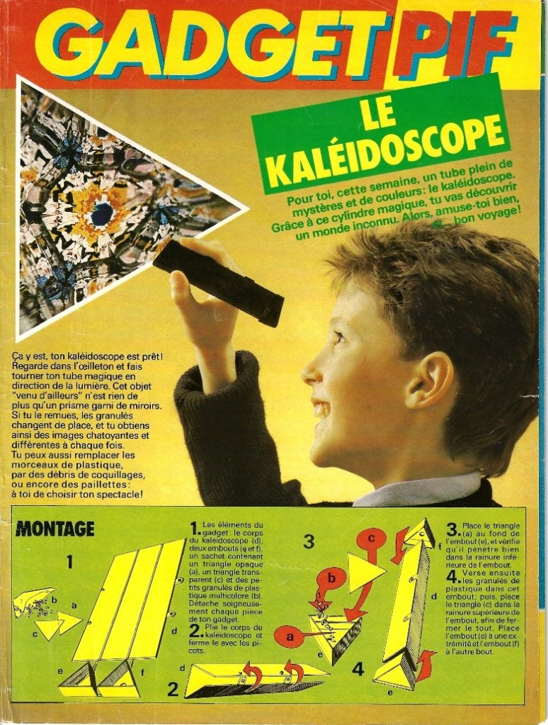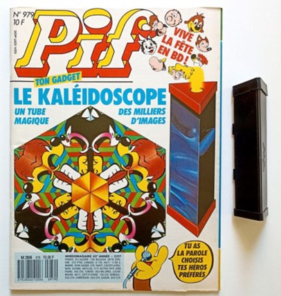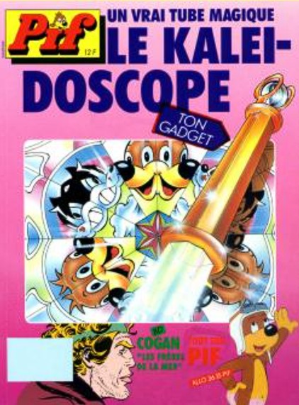 Pif Gadget est un magazine de bande dessinée français lancé en 1969 par les éditions Vaillant. Le magazine contenait des bandes dessinées humoristiques et d’aventures captivantes avec des personnages emblématiques comme Pif le chien, Hercule, Rahan… et il était inclus un gadget ingénieux dans chaque numéro. Une idée innovante qui a contribué à son immense succès auprès des jeunes lecteurs des années 1970 et 1980. Parmi les gadgets les plus célèbres, certains ont particulièrement marqué les esprits, comme les pois sauteurs du Mexique, et divers jouets scientifiques dont le célèbre kaléidoscope. Cet article propose de revisiter les magazines Pif Gadget aux couvertures colorées et dynamiques qui mettaient en avant ce jouet coloré et hypnotique, et de nous attarder sur les pages qui concernent le kaléidoscope. Pif Gadget aimait proposer des gadgets qui éveillaient la curiosité des jeunes lecteurs. Le kaléidoscope, en jouant avec la lumière et la symétrie, permettait d’explorer la réflexion et les illusions d’optique, avec ses formes et couleurs changeantes, c’est un gadget parfait pour stimuler l’imagination des enfants. Contrairement à d’autres gadgets plus passifs, le kaléidoscope demandait une manipulation active. L’enfant pouvait expérimenter différents angles et mouvements pour créer des combinaisons infinies, prolongeant ainsi le plaisir bien après la lecture du magazine. Introduit dans plusieurs numéros de Pif Gadget, il apportait une touche de magie et de rêve, transformant une simple revue en une véritable expérience sensorielle unique, leur permettant de découvrir des motifs colorés et changeants en tournant l’objet. Comparé aux gadgets plus fragiles ou à usage unique (comme les pois sauteurs), le kaléidoscope était un objet réutilisable, qui pouvait être conservé et utilisé longtemps après l’achat du magazine. Cela correspondait parfaitement à l’esprit ludique et éducatif du magazine. Ce gadget n’était pas seulement populaire pour ses effets visuels, mais aussi pour son aspect ludique et éducatif.