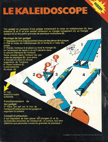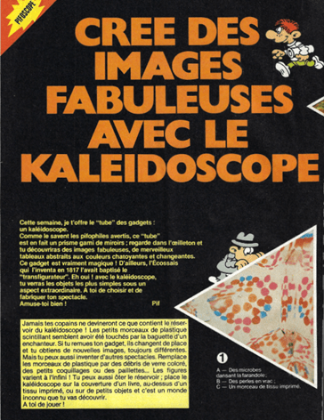 Le gadget se compose d’un corps en carton prédécoupé, d’un sachet de perles multicolores, d’un morceau de calque et de plaques de métal en guise de réflecteur, le tout est à assembler pour obtenir un kaléidoscope. Le corps du Kaléidoscope est à l’intérieur du magazine imprimé sur un papier touché glacé sur un papier cartonné pré-découpé. Le kaléidoscope n’est pas un cylindre mais un tube hexagonal, ses arêtes lui permettent d’être plus solide mais aussi plus simple à construire.
