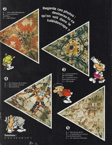 Lorsque l’on regarde cette page, on voit que la rédaction a fait du recyclage. Le gadget est le même, d’un plastique noir triangulaire. Un garçon souriant montre comment tenir le kaléidoscope. Comme c’est une expérience solitaire. Alors la rédaction a mis une image pour représenter ce que l’on voit à l’intérieur. Cette image est déjà présente dans le dossier pifoscope du magazine N°578 d’avril 1980, c’est l’image N°3 de même que les schémas pour expliquer le montage.