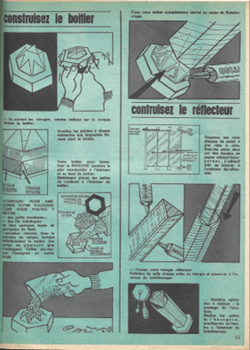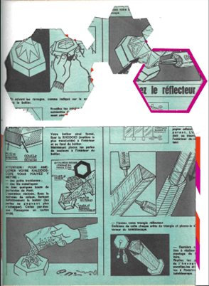 Construisez le réflecteur / Disposez les trois plaques de métal à plat côte à côte, fixez-les entre elles par des bandes de papier adhésif transparent. L’adhésif doit se trouver à l’extérieur du réflecteur. / – Formez votre triangle réflecteur. Enduisez de colle chaque arête du triangle et placez-le à l’intérieur du kaleïdoscope. / Dernière opération à réaliser : le montage de l’oculaire. Repliez les pattes de l’hexagone, encollez-les et fixez-les à l’intérieur du kaleïdoscope.