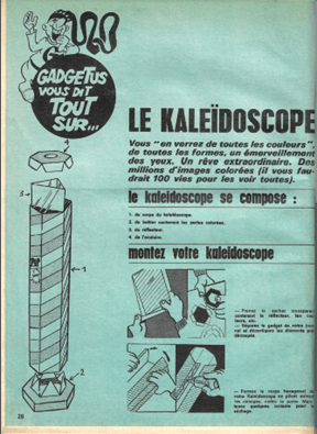 « Gadgetus vous dit tout sur le kaleïdoscope / vous « en verrez de toutes les couleurs », de toutes les formes, un émerveillement des yeux. Un rêve extraordinaire. Des millions d’images colorées (il vous faudrait 100 vies pour les voir toutes).