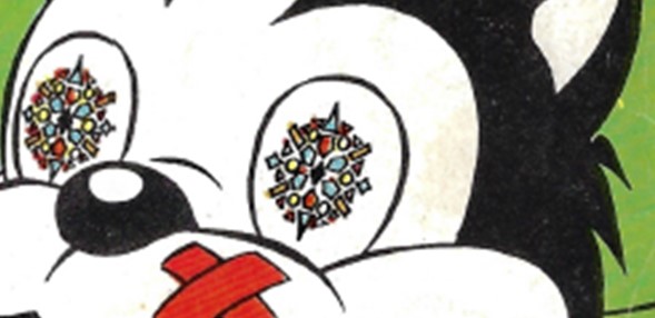 Comme je le disais précédemment, il y a une incohérence entre le motif représenté par le dessinateur et les motifs que nous pouvons observer dans le kaléidoscope fourni avec le magazine. Sur l’image 8, on peut voir dans les yeux du personnage une rosace à 4 sections.