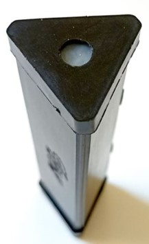 - Verse ensuite les granulés de plastique dans cet embout ; puis place le triangle (c) dans la rainure supérieure de l’embout afin de fermer le tout. Place l’embout(e) à une extrémité et l’embout(f) à l’autre bout.