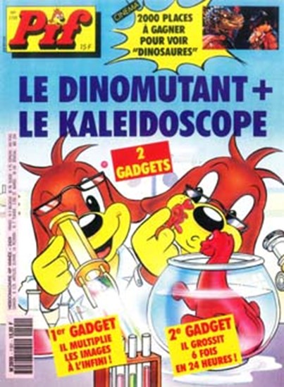 La couverture du Pif Gadget N°1191 présente le nouveau logo du magazine Pif Gadget. On peut y observer le chien « Pif » dédoublé, ils portent une blouse de laborantin et des lunettes. On dirait qu’ils sont dans un laboratoire. On peut voir à droite de l’image le haut d’un microscope et sur la table des tubes à essais et des flacons dont l’un est rempli d’un liquide rouge. Le premier pif plonge un dinosaure dans un bocal d’eau rond. L’autre a relevé ses lunettes pour regarder à l’intérieur d’un kaléidoscope. Deux gadgets étaient offerts avec le magazine « le Dinomutant » et « Le kaleidoscope ». Malheureusement, le « dinomutant » qui grossissait 6 fois sa taille une fois immergé dans l’eau a été jugé non conforme aux normes en vigueur. Ce qui a conduit à l’arrêt de la vente du journal et la destruction du gadget. Contrairement aux autres numéros de magazines que l’on retrouve facilement sur le marché de l’occasion sans gadget. Je n’ai actuellement pas réussi à trouver cet exemplaire.